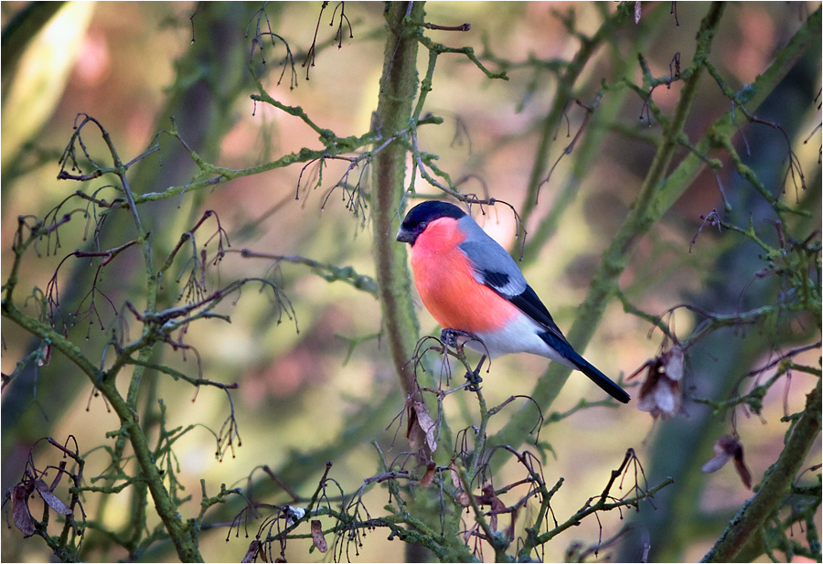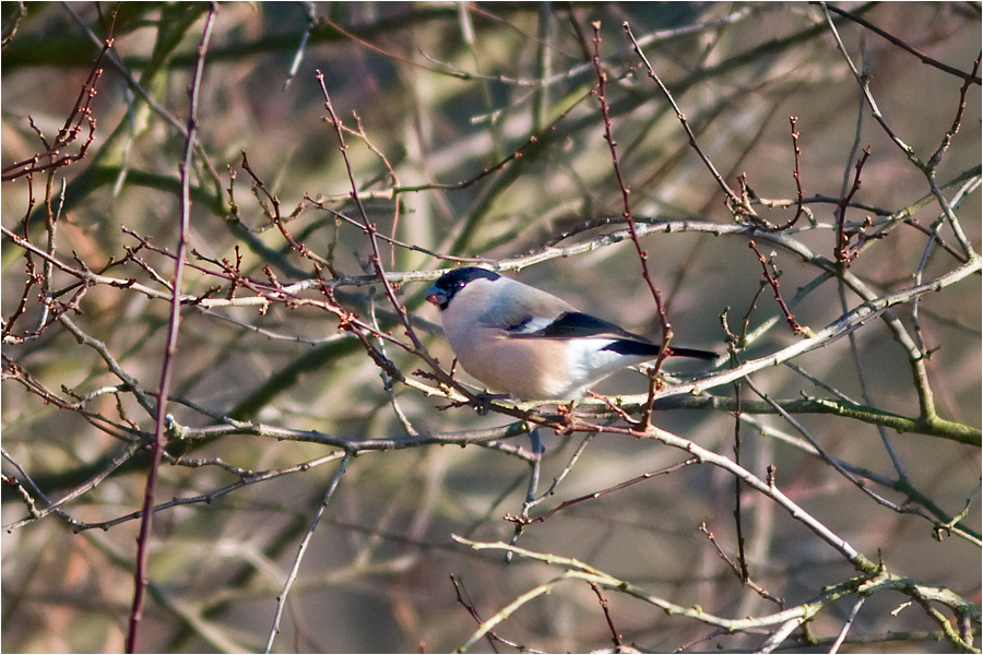 Dompfaff Männchen und Weibchen, vom Balkon aufgenommen.